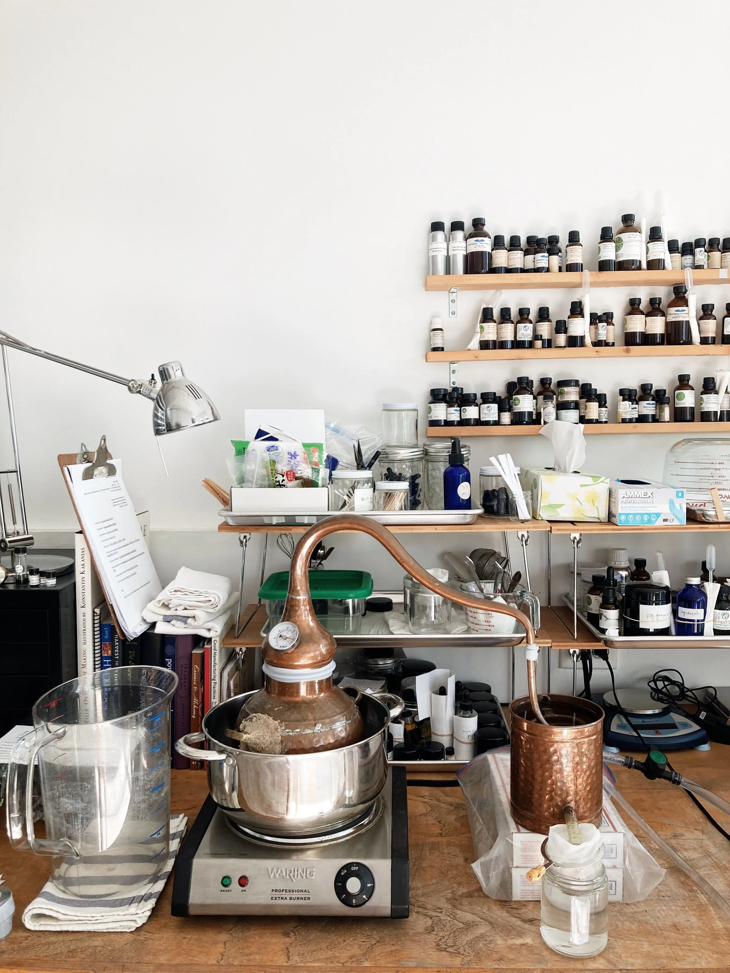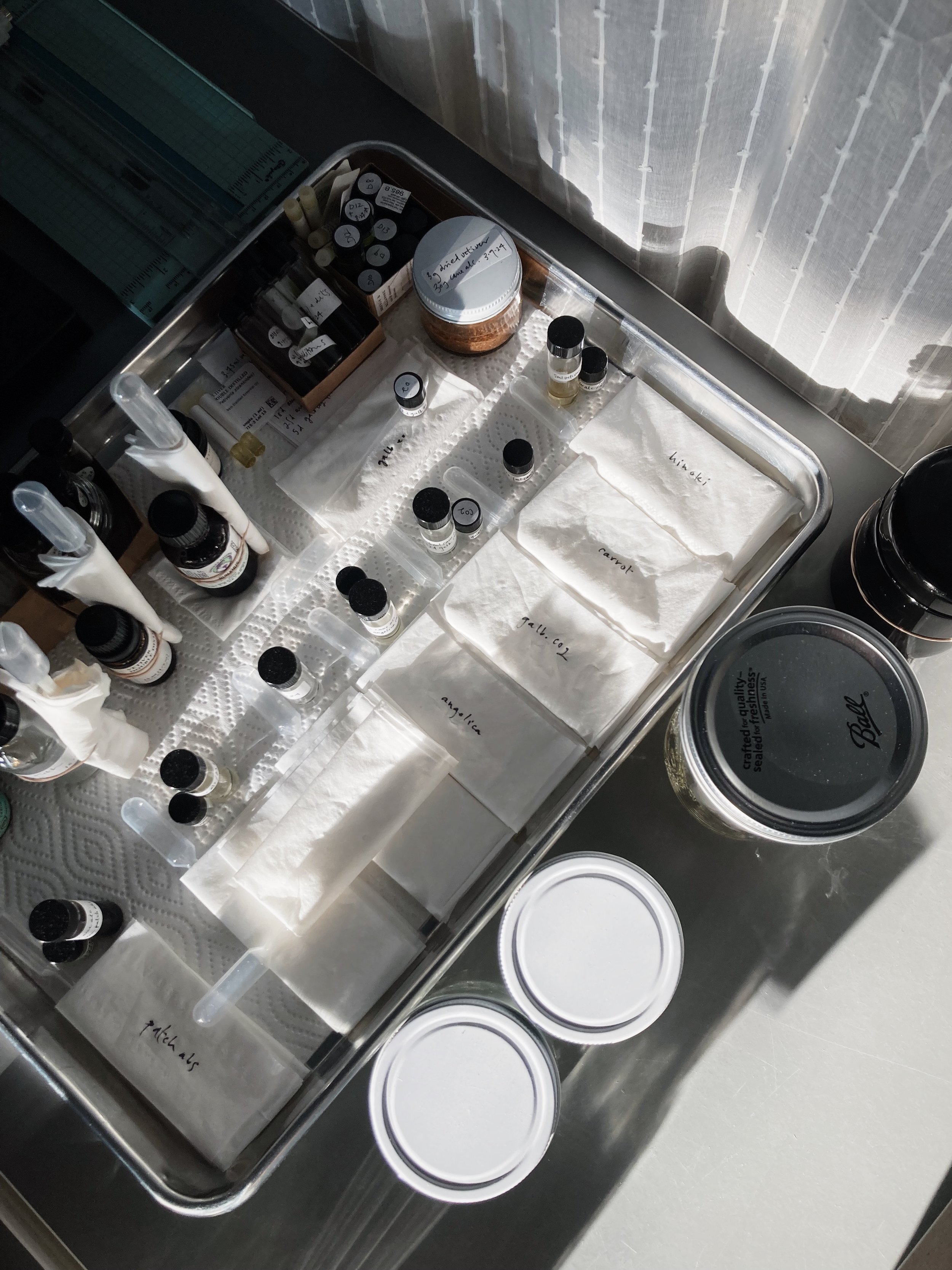 At any given moment, there are usually dozens of drafts of various projects around the studio. Experimental aromatic tinctures infusing quietly in their jars, perhaps a box full of ten different tiny vials exploring a minute difference in the concentration of a formula.