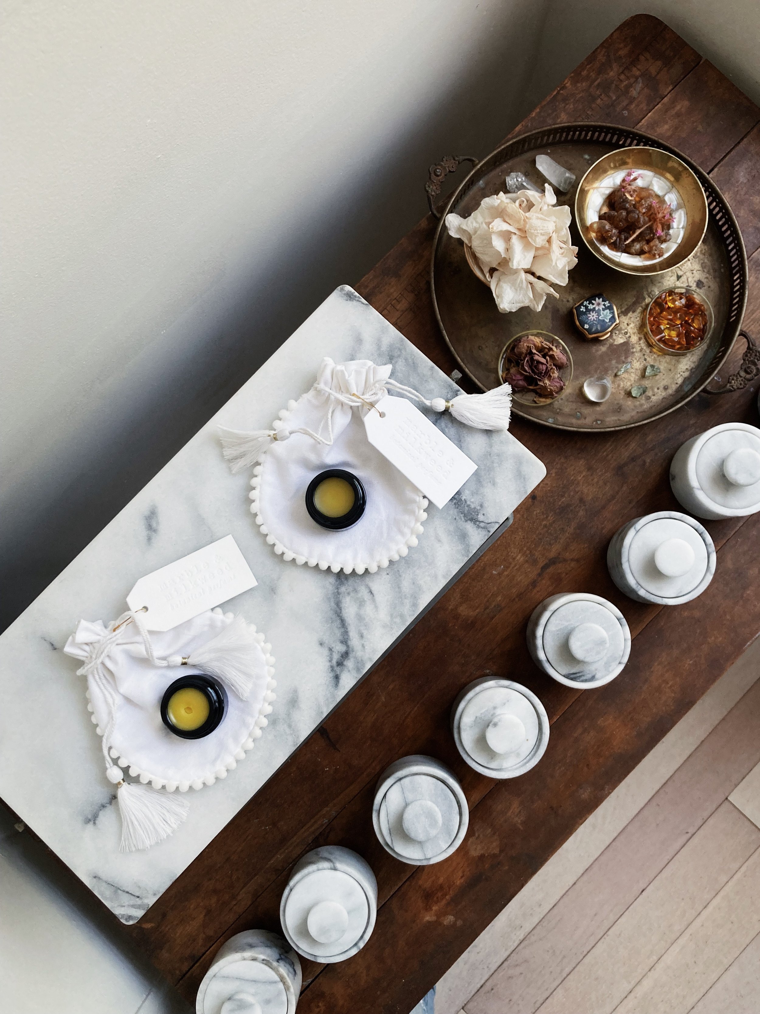 sending out a set of botanical perfume balms. this solid perfume format is perfectly portable for travel. The beeswax base helps hold the scent close to the skin, I always find perfume balms to wear a bit more intimately than an oil or an extrait.